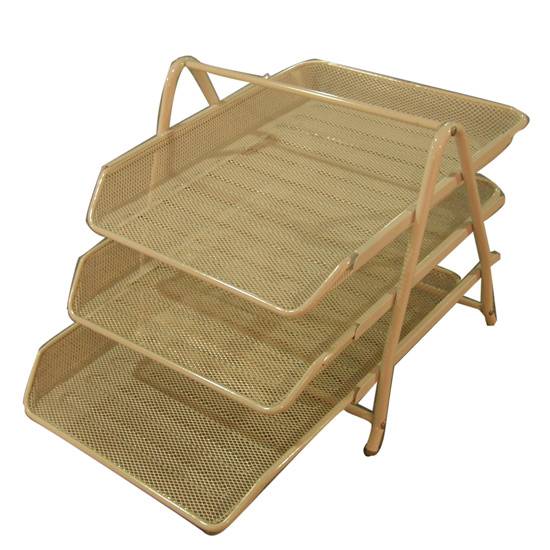 This is a paper holder or document tray which fits the size of A4 papers. It is made of metal and has many small holes like rattan products.