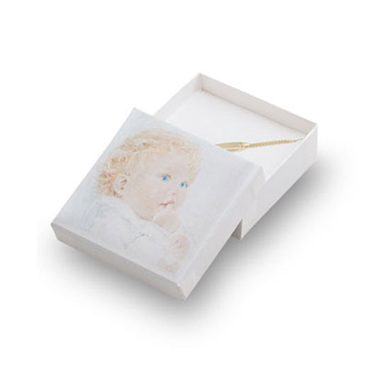 This paper jewelry box comes with a distinctive baby pattern for catching people’s attention. The classical rectangular shape is modest. The top-quality glossy cardboard paper adds a stylish touch to the box.