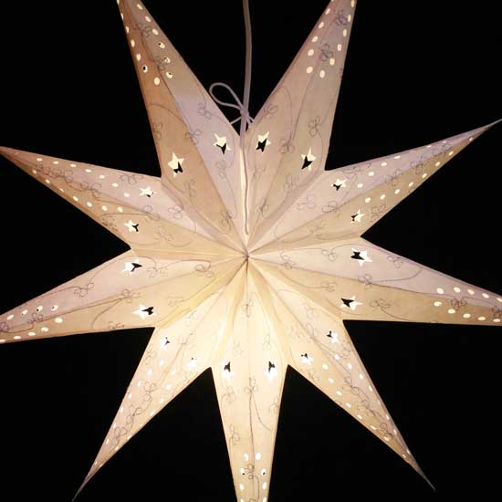 The picture displays a unique paper lantern in a 3D nine-point star design. The elegant paper lantern is further highlighted by printed floral motifs and cutout star and circle patterns. This stylish light lantern is suitable for parties and other celebrations.