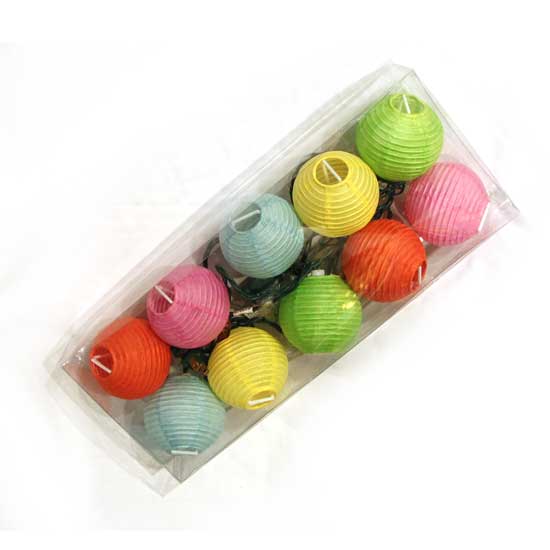 This fancy paper lantern string features small round lanterns in assorted colors. Using an LED light source, this lantern string adds charm to your household while saving energy. Powered by rechargeable batteries, this decoration can be moved easily according to your needs.