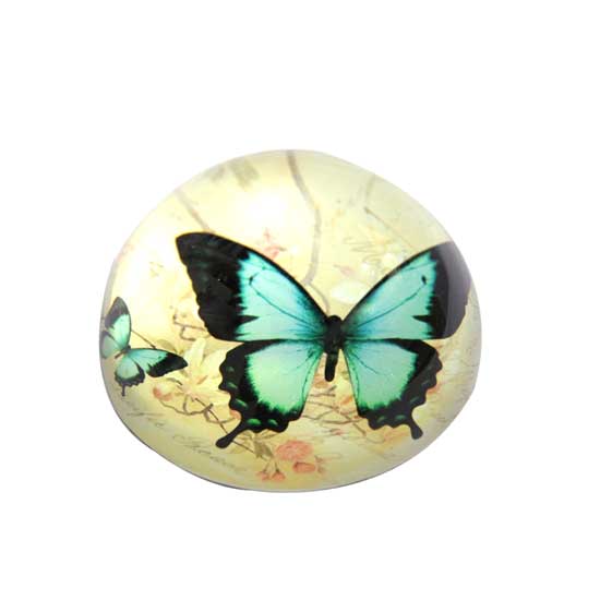 Displayed is a paper weight made of crystal in a dome shape. Featuring butterfly figures, this paper weight brings a touch of elegance onto your desk. This beautiful paper weight is a nice choice for home decoration.