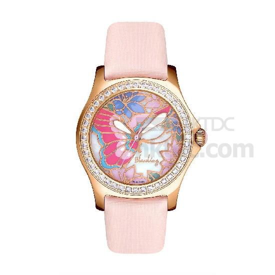This Blauling jewelry watch stands out from the rest with its charming and attractive appearance. It applies the color gradation on mother-of-pearl dial to simulate the flying butterfly, which contributes to the strong visual impact. The rose golden case is meticulously adorned with sparkling stones for enhanced uniqueness.