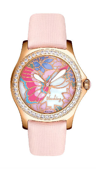 This Blauling jewelry watch stands out from the rest with its charming and attractive appearance. It applies the color gradation on mother-of-pearl dial to simulate the flying butterfly, which contributes to the strong visual impact. The rose golden case is meticulously adorned with sparkling stones for enhanced uniqueness.