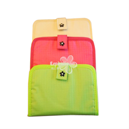 - Exterior snap closure with a floral embellishment.