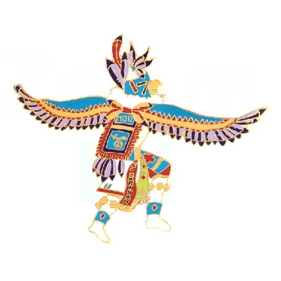 This badge depicts a bird-like figure in a colorful costume, showcasing an eccentric posture. It is uniquely designed with an esthetic touch. This is an incredible addition for badge collectors.