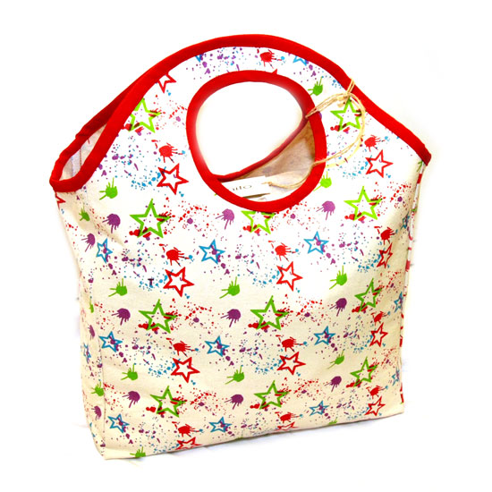This patterned bag features a spacious compartment for your accessories. Its shell is styled with vivacious motifs in appealing colors. The top and handles are accented by sharp red trim.