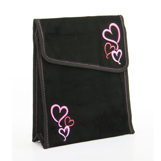 This girlish pouch features black fabric with pink heart-shaped patterns. A pink stitched line decorates the hem of this pouch. It can be used for storing various miscellaneous items.