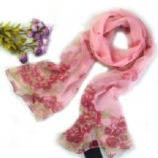 Presented here is a scarf made for ladies. The floral patterns add an elegant look to the scarf. This patterned scarf is easy to mix and match.