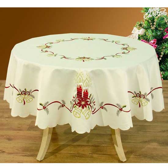 This patterned tablecloth is weaved with soft and durable material. It is ornamented with engaging bell, candle and floral patterns. The edge of it is accented by a corrugated design.