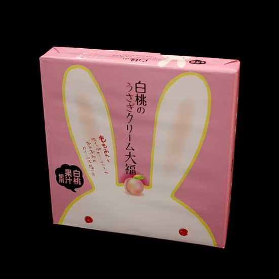Displayed is a pack of peach cream daifuku that uses high quality peach juice. The mochi is soft and chewy while the stuffing is fruity and refreshing, presenting a perfect combination of taste and texture. This delicious peach cream daifuku is a good choice for snacks.
