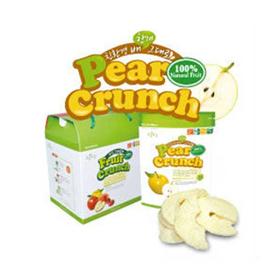 Introduced are Korean pear crunches made with 100% naturally frozen and dried fruit. The healthy pear crunches are sliced from real pears. No sugar, additives or preservatives were added in the manufacturing process.