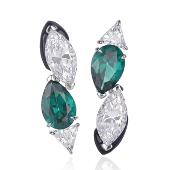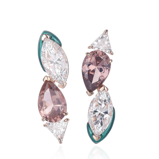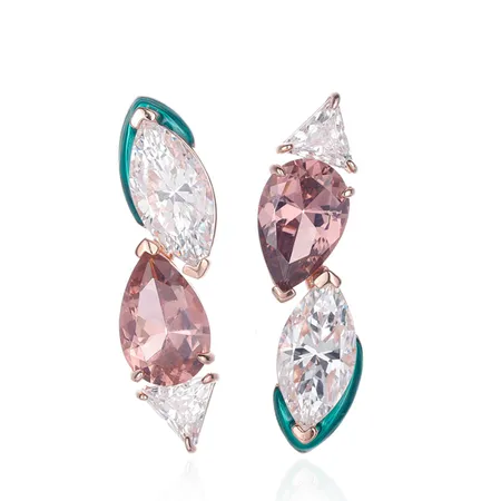 Pear Shape Morganite Nano And Marquise White Cubic Zircon Rose Gold Plating Silver Earring With Green Enamel