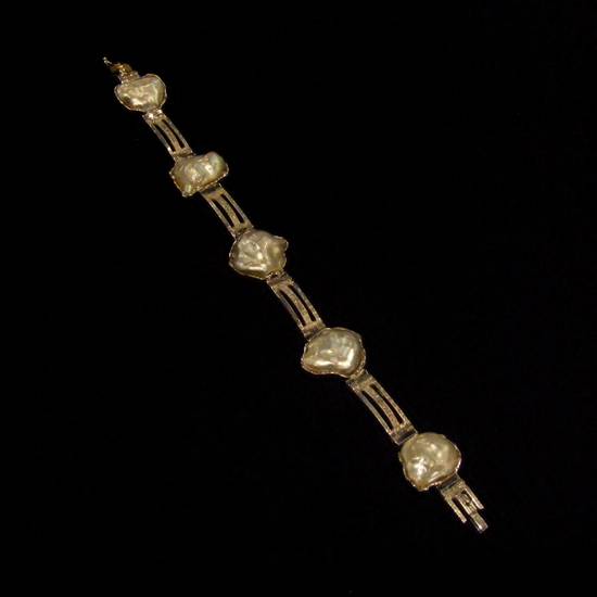 The featured item is a pearl bracelet in gold. The bracelet comes in a gold chain and 5 pearls are set alternatively with the chaining.