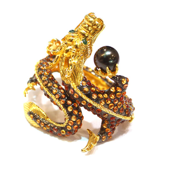 This beautifully crafted Chinese dragon bangle features a luxurious construction. The fierce creature is fully covered in orange citrine stones. It possesses a lustrous black south sea pearl in its claws and a pair of emerald eyes for extra detail.