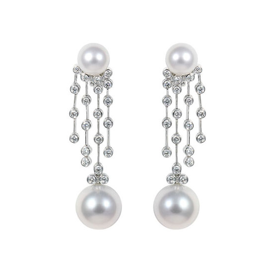 Displayed is a pair of white Australian South Sea pearl earrings that comes in a dangle style. The elegant long dangles have diamond-accented tassels for a leisurely touch. These gorgeous pearl earrings are wonderful to go with cocktail dresses.