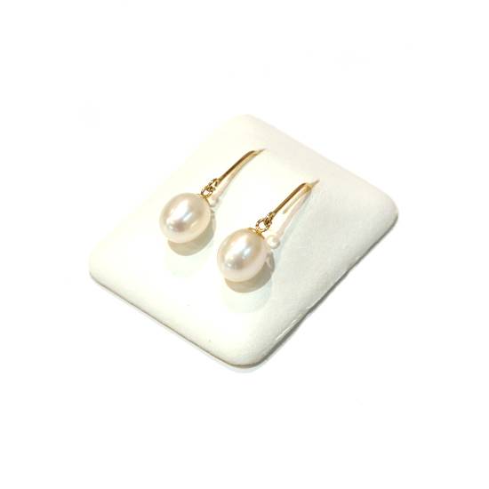 This is a pair of pearl earrings set in 18k yellow gold. It features two oblong fresh water pearls. The drop earrings are suitable for sensitive skin.