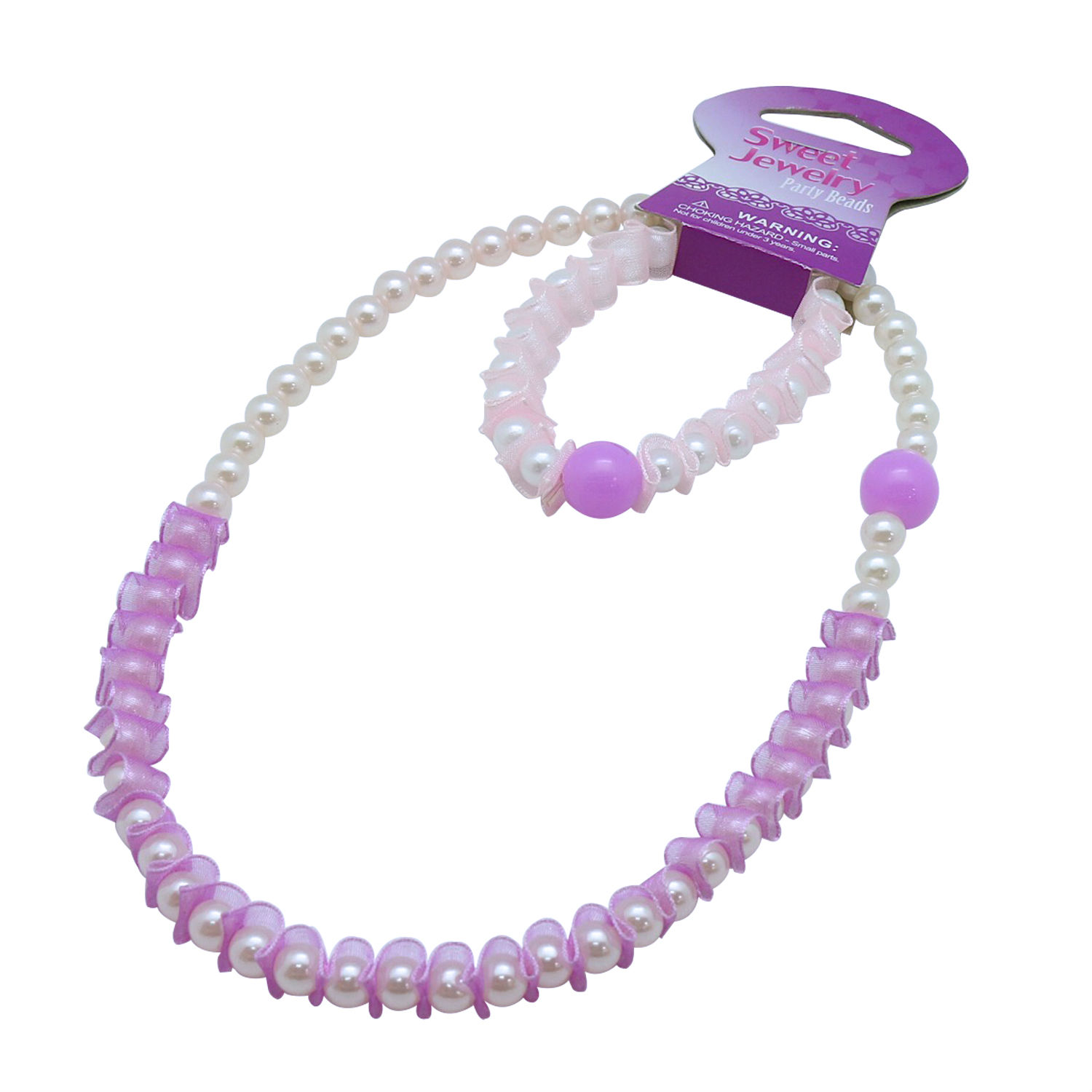 With bracelace & necklace pearl color bread with ribbon 22" inch , color: pink & pearl