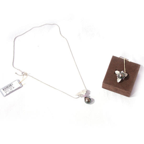 This enchanting jewelry set is completed by a ring and a necklace. The elegant mistletoe centerpieces celebrate the joy of the Christmas season. Topped with Tahiti black pearls on 18K white gold settings, this dazzling jewelry set is simply gorgeous.