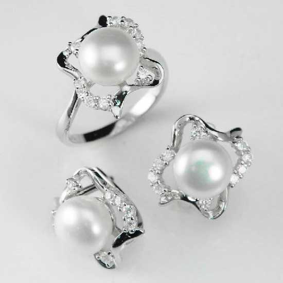 This stunning jewelry set comes with a pair of earrings and a finger ring. The large freshwater pearl in white and shimmering stones accent each piece. Finely crafted of 925 sterling silver, this jewelry set is finished with a highly glossy finish.