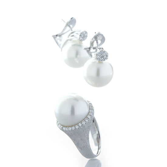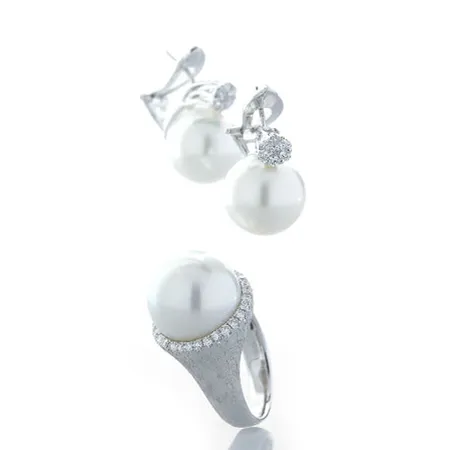 This is a pearl jewelry set that comes with a ring and a pair of earrings. Each featuring a large and round Australian South Sea pearl, the pieces are elegant and gorgeous. This high quality pearl jewelry set is mounted on 18K gold for durability.
