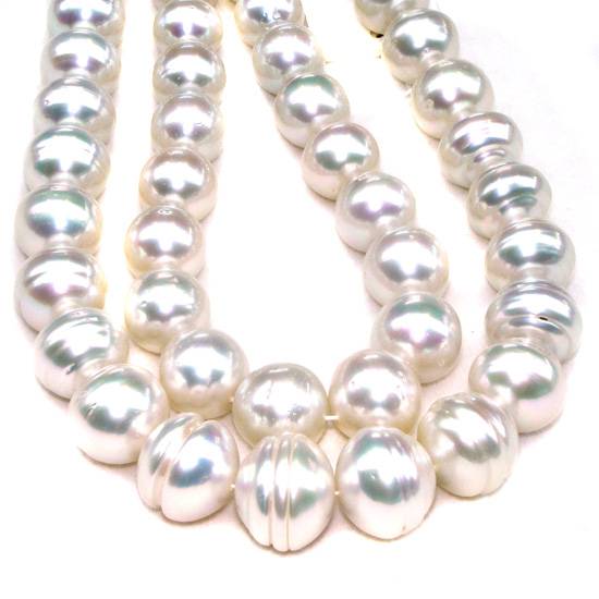 As shown is a south sea pearl necklace. The pearls are black in white in colour in spherical shape. They are well polished for maximum shine and lustre.