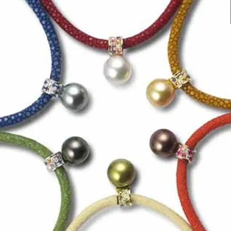 This pearl necklace features a thick round band in a fancy color, holding a lustrous pearl to shine with alluring radiance. The band comes with a modern rugged surface and plays a miraculous contrast to the smooth round pearl. This pearl necklace adds exceptional vitality to your neckline.