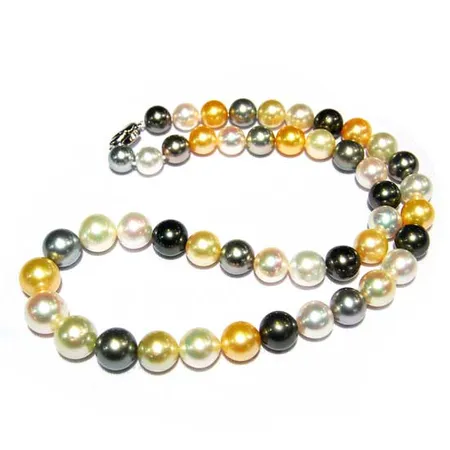 The pearl necklace features a captivating combination of different selected pearls. They include white South Sea pearls, gold South Sea pearls and Tahitian black pearls. This necklace will sure turn heads in any grand occasions.