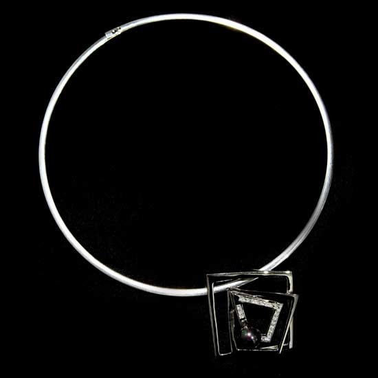 Showcased is a necklace with a contemporary design. It is made of 925 sterling silver with rhodium plating. This necklace is adorned with cubic zirconia stones and a black pearl.