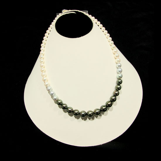 This exquisite pearl necklace is made with pearls in three colors. Black pearls, silver pearls and white pearls are combined to produce an intriguing visual effect. This fancy pearl necklace highlights the elegant charm of the wearer.