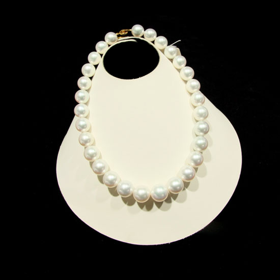 Showcased here is a silvery white pearl necklace. This piece of jewelry is made with beautiful round pearls of irresistible shine and luster. Pearl jewelry made with other types of pearls are also available.