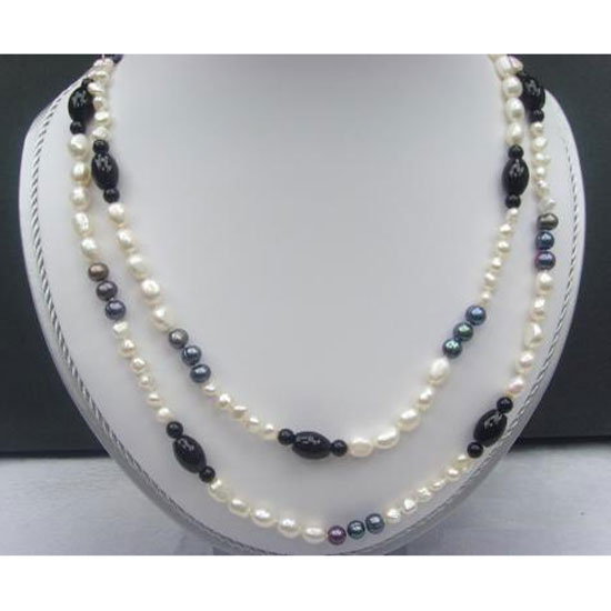 • 8-8.5mm irregular white pearl with 7-7.5mm line potato peacock pearl, 7-7.5mm irregular white pearl and black onyx.