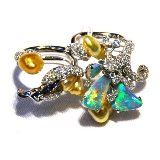 The unique pendant showcases brushed 18K white gold construction. It is encrusted with keshi pearls, opal and diamonds to give brilliant luster. Accessorize a beautiful evening look with this gorgeous pendant.