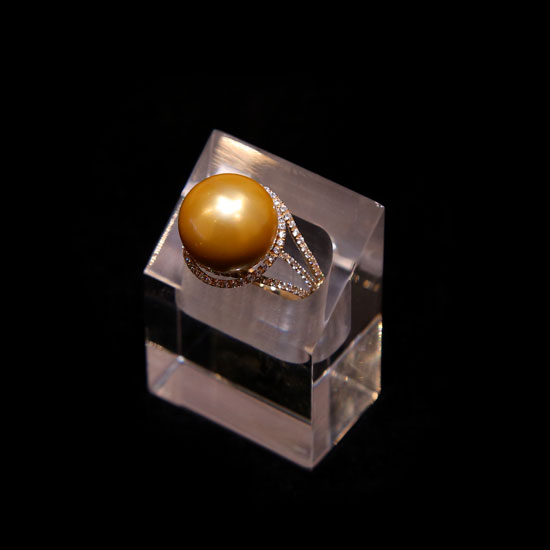 Feminine and elegant, this finger ring comes with a precious golden pearl. The glossy, caramel-colored pearl is carefully set on the finely-crafted, slim split-shank ring. Adorned with dazzling diamonds, this finger ring will surprise everyone with its unmatched exquisiteness.