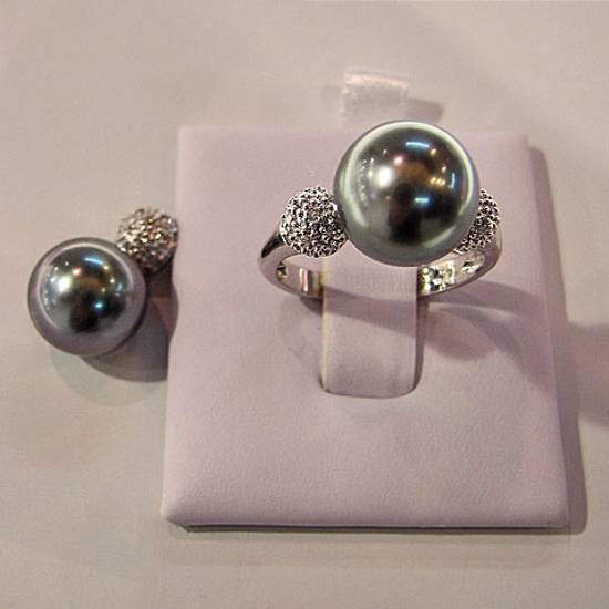 As shown is a black pearl ring in tension setting. The shoulder of the ring is designed with hammered features. The ring comes with other matching jewellery pieces, such as a pendant.