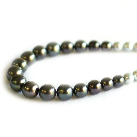 This is a strand of black pearls with a stylish appearance. These pearls are finely polished to show maximum luster. This strand of pearls is ideal for your high-end jewelry designs.