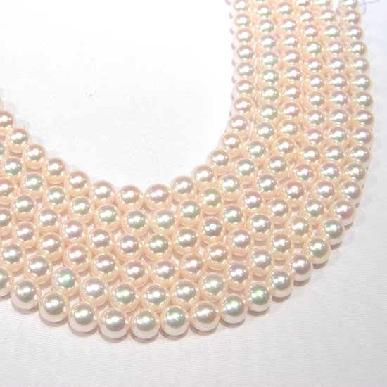 Showcased are multiple strands made of precious Akoya pearls. The pearls look spectacular in evenly round shape, in a pure white luster. The beautiful pearls exude a sense of elegance to please ladies’ eyes.