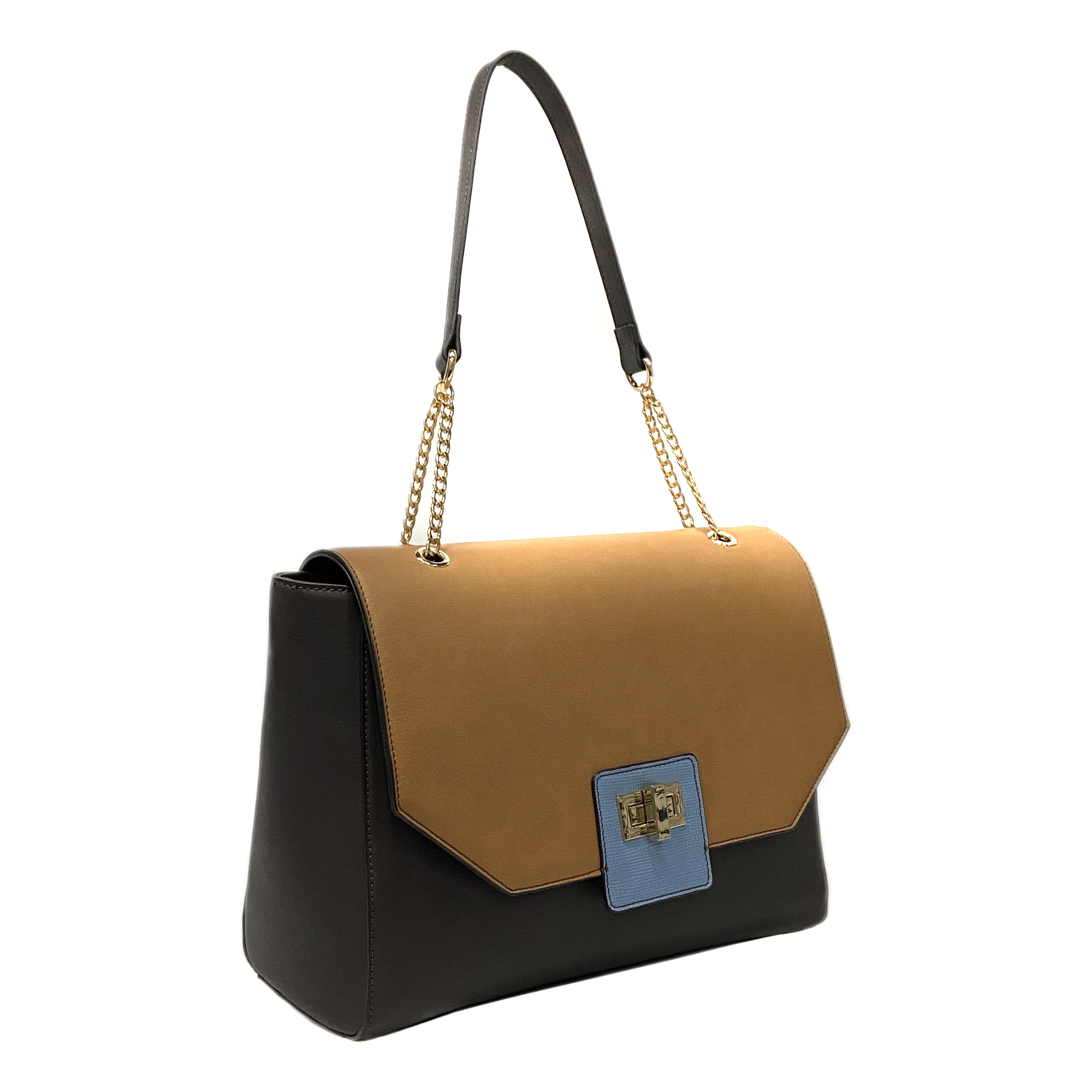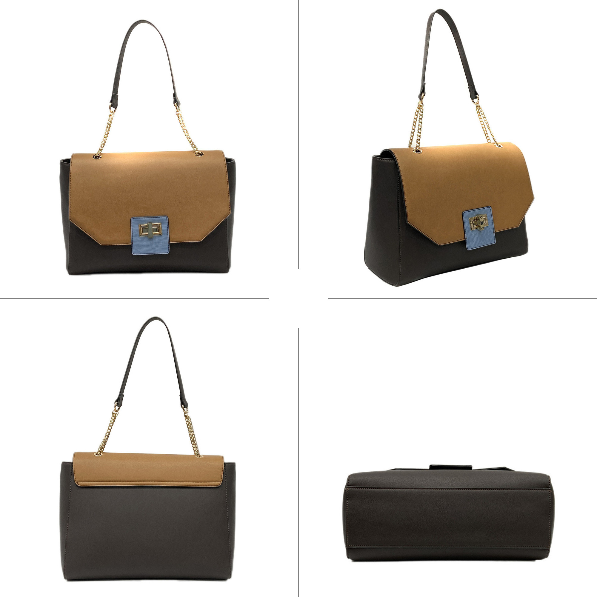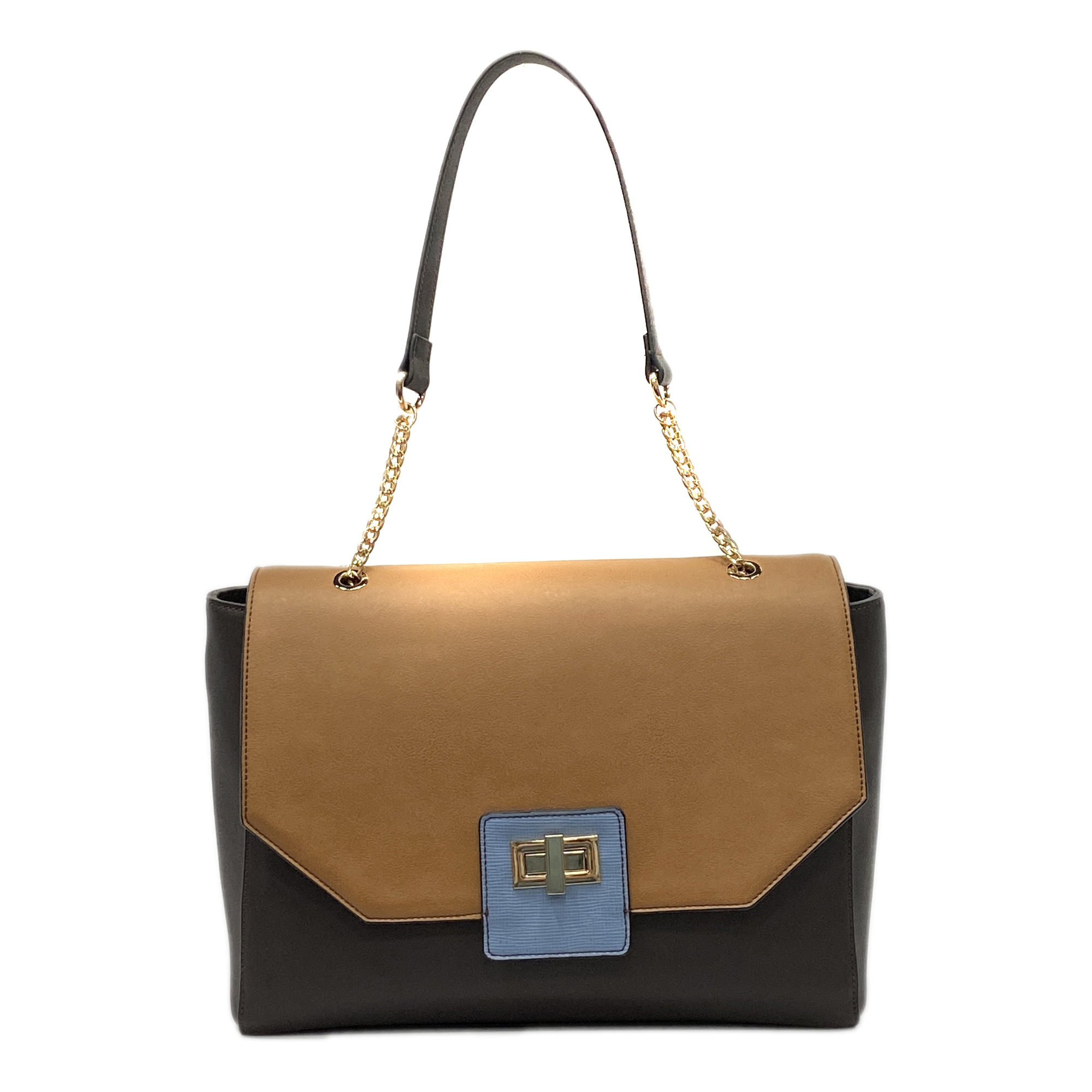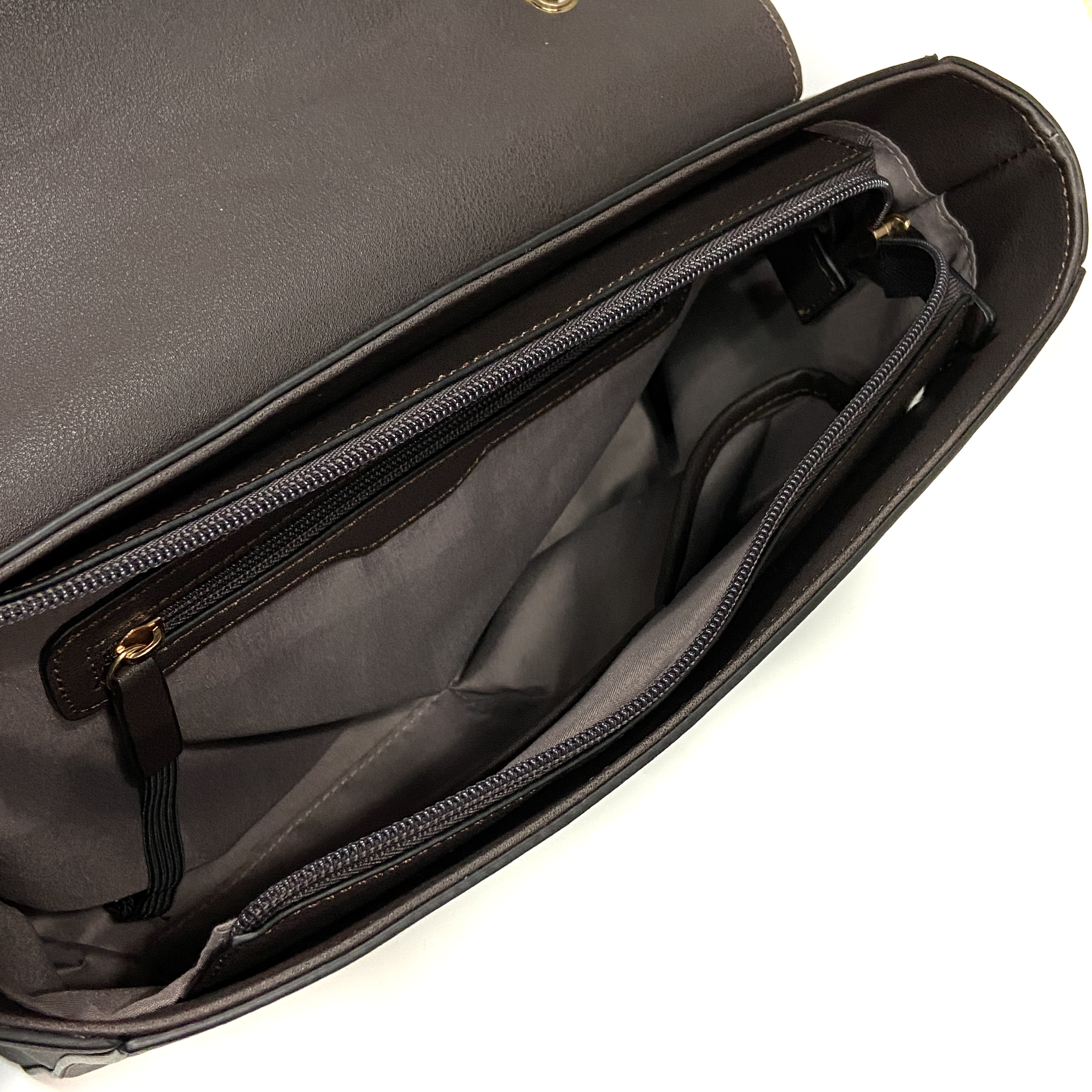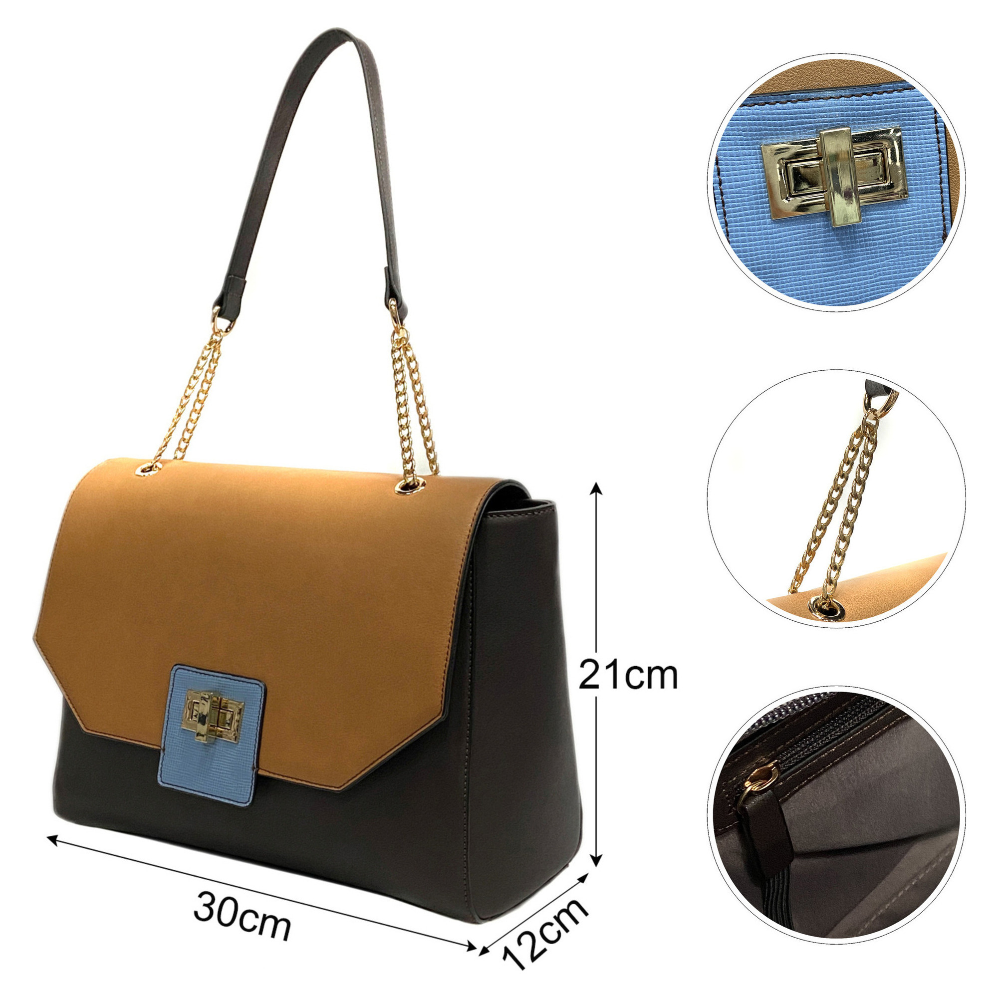 • Metal chain strap, Metal turn lock closure, 1 Interior zip pocket & 2 Interior slip pockets