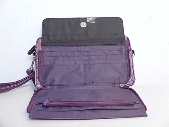 Flap pocket os magnetic button and zipper for the closure, inside have zipper pocket, slip pocket and credit card holder.