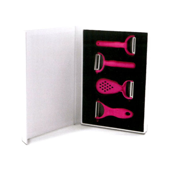 This peeler set features a pink finish and is packaged tidily in a box. The peeler is designed for removing skins of fruits and vegetables. The handles are made of quality materials to prevent accidental slipping.