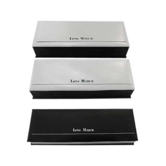 Displayed are three pen packaging boxes coming in a rectangular shape. They feature a black and white appearance with a brand name printed on the top. Constructed from plastic, these stylish pen boxes are sure to last for a long time.