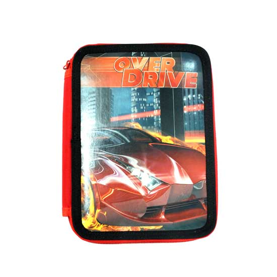 This pictured pencil case features a rectangular shape. The colorful car illustration adds a cool-looking accent to the pencil case. It flaunts a zipped closure for easy access to its contents.