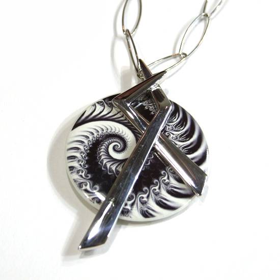 This is a pendant made of sterling silver. The pendant is decorated with patterned porcelain of white and black in colour.