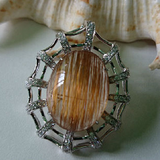 This is a multi-use jewelry piece that can be used as a pendant and also a brooch. It features an 18K white gold mounting with a beautiful and parallel copper rutilated quartz cabochon in the center. This item is paved with shimmering diamonds for a touch of style.