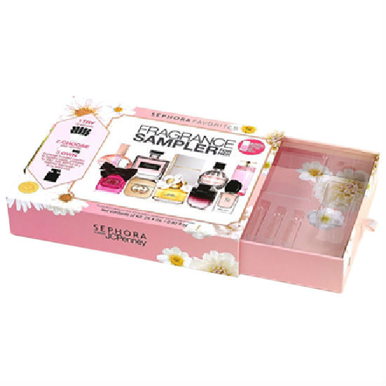 Featured here is a packaging box for perfume products. It is rectangular shaped and is printed with promotional materials on the exterior. The box has transparent tray inside designed for holding perfume bottles.