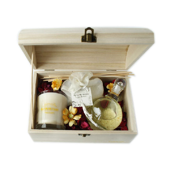 Featured here is a charming perfume gift set packed in a delicate wooden chest. It includes fragrance candle, reed diffuser and assorted decorations. This beautiful set delights your friends and family.