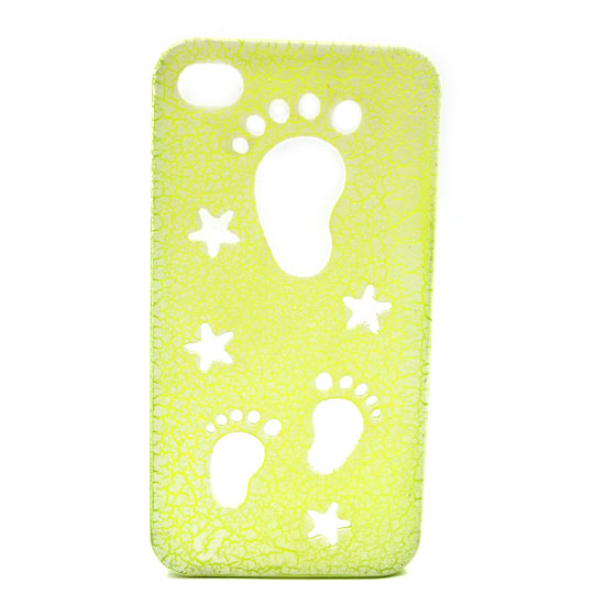 This is a phone case designed in fluorescent green. It is made of high-quality plastic for long-lasting use. This phone case is designed with footprints and star patterns for added style.