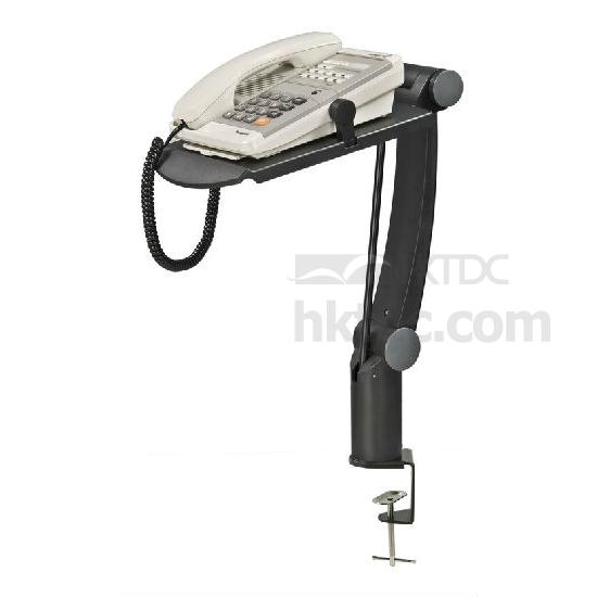 Showcased is a desktop telephone holder with a flexible arm. This phone holder featuring elastic clips keeps your phone firmly onto the stand. The flexible and adjustable arm allows the panel to rotate in 360 degrees and lift up to 410mm off the table-top. Mount your phone on this phone holder for extra space saving on your desk.