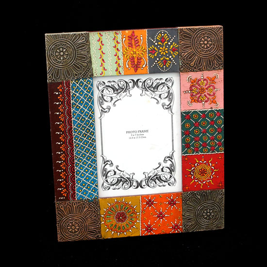 The photo frame is designed to display a 5 x 7" portrait-shaped photo. It is made out of wood and brass for sturdy and durable construction. The frame features various ethnic patterns for a dash of style.