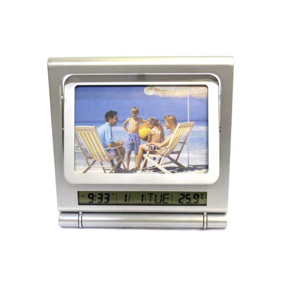 This chic silver-hued photo frame is constructed from ABS for sturdiness. It is also equipped with a digital display to show the time, date and temperature. This functional photo frame is ideal for home use.