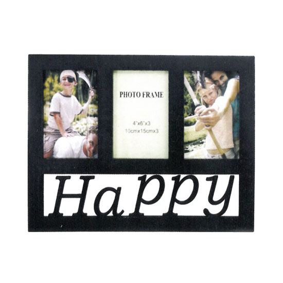 This is a photo frame with a stylish and unique design. It comes in a rectangular shape with the word "Happy" on the lower half part. This frame can display three pictures at the same time.